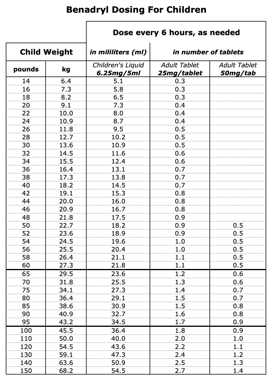 - “Children’s Benadryl Liquid” – contains 6.25mg of Benadryl per 5ml.