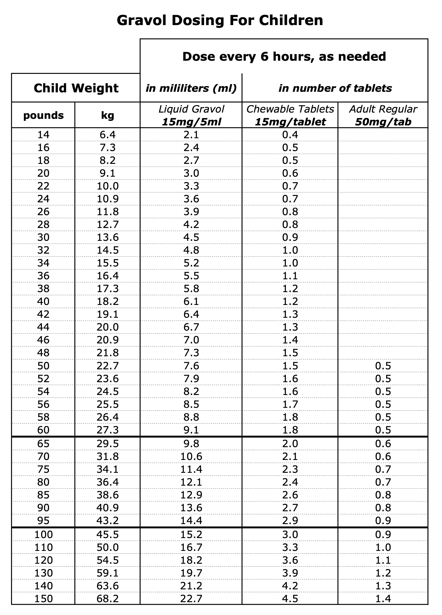 Children’s Gravol may come in many different strengths and forms. Be sure you look on the bottle to know what form you are using. The most common forms are: